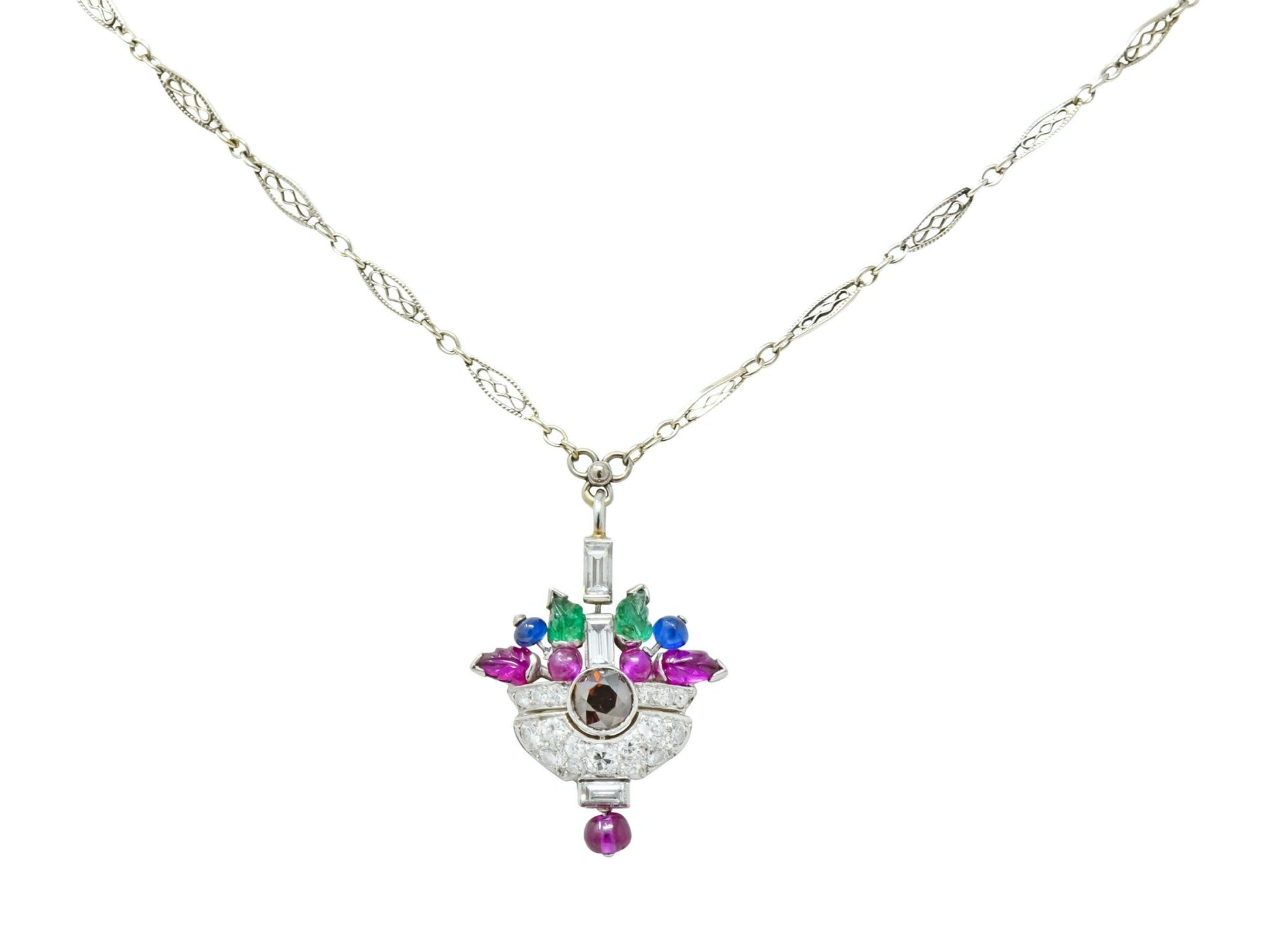1930's Art Deco 1.20 CTW Diamond Sapphire Emerald Ruby Platinum Tutti Frutti Pendant Necklace