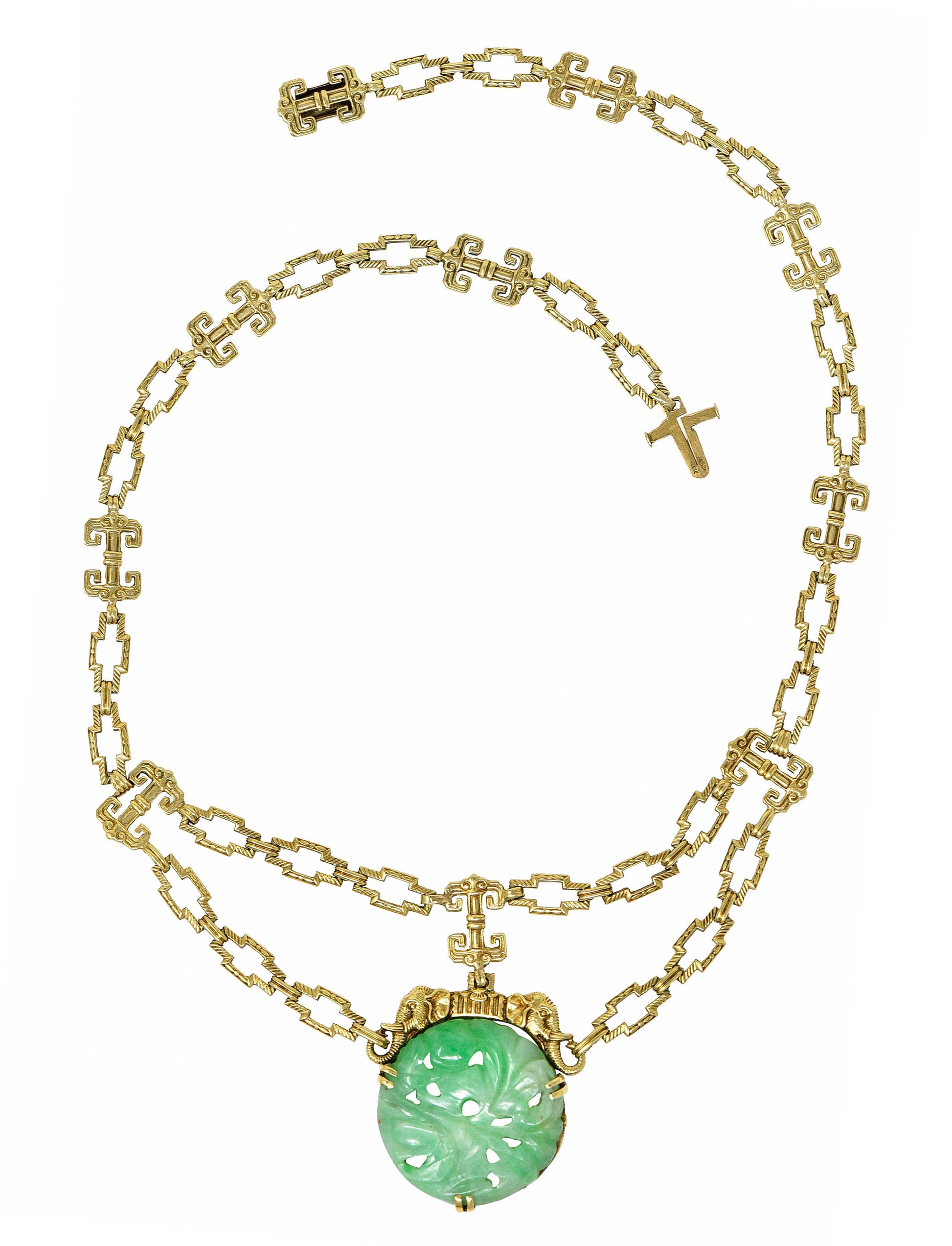 - Featuring a 24.5 mm circular tablet of carved jade depicting stylized foliate