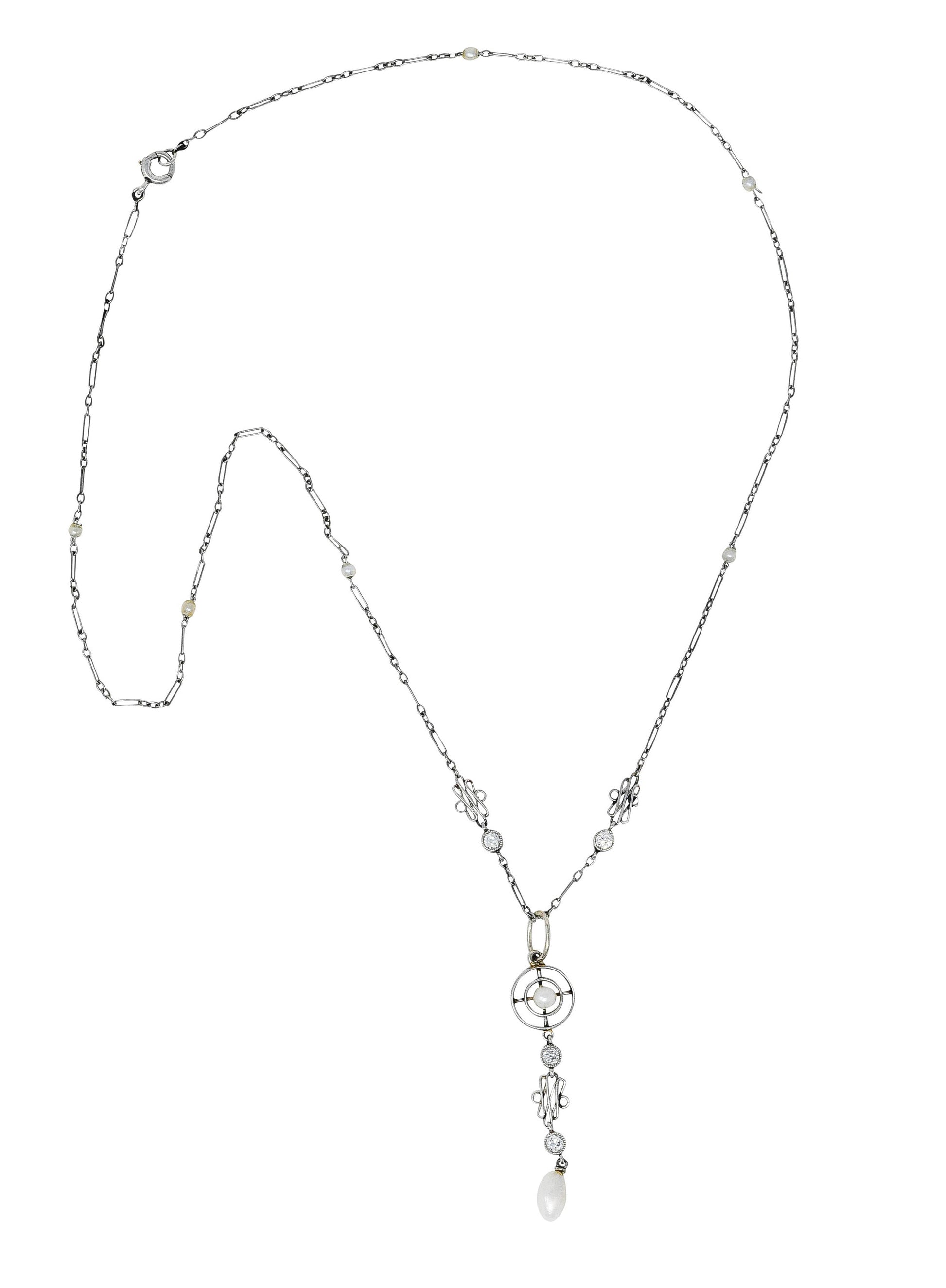 1920's Art Deco Diamond Pearl Platinum Pendant Necklace