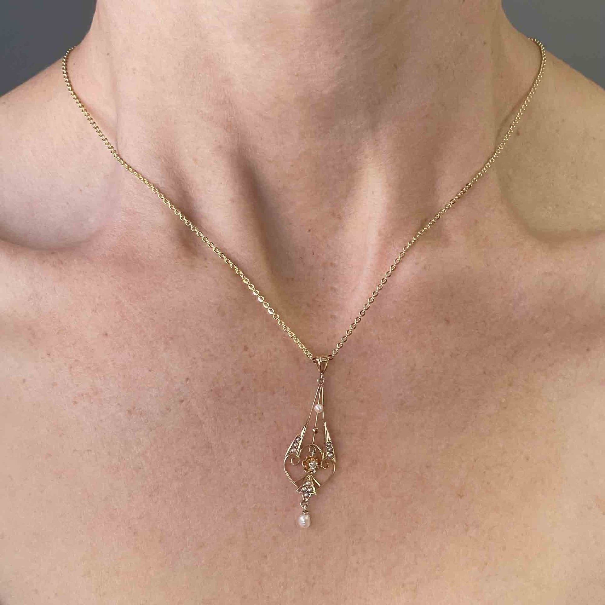 10K Gold Art Nouveau Pearl Diamond Lavalier Necklace