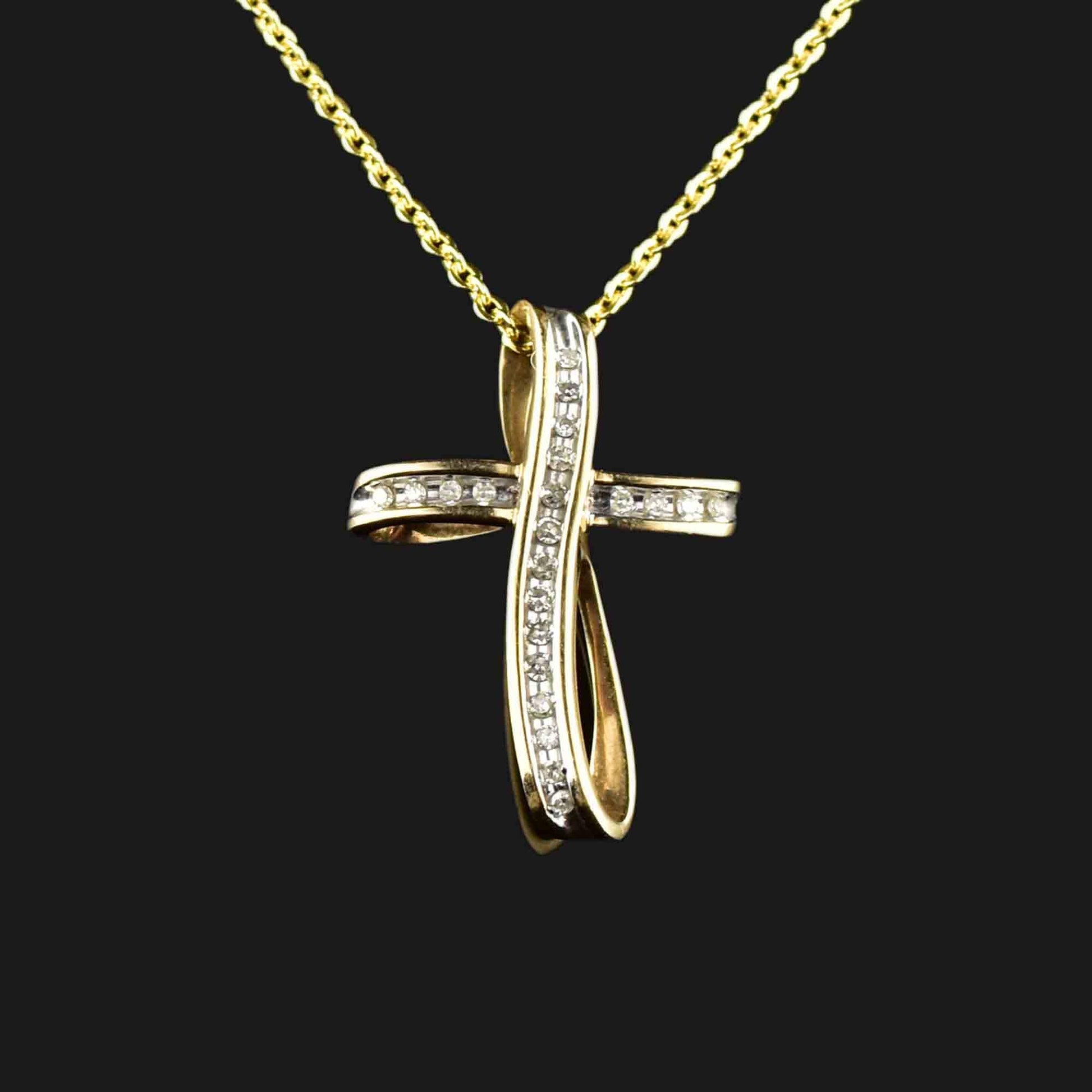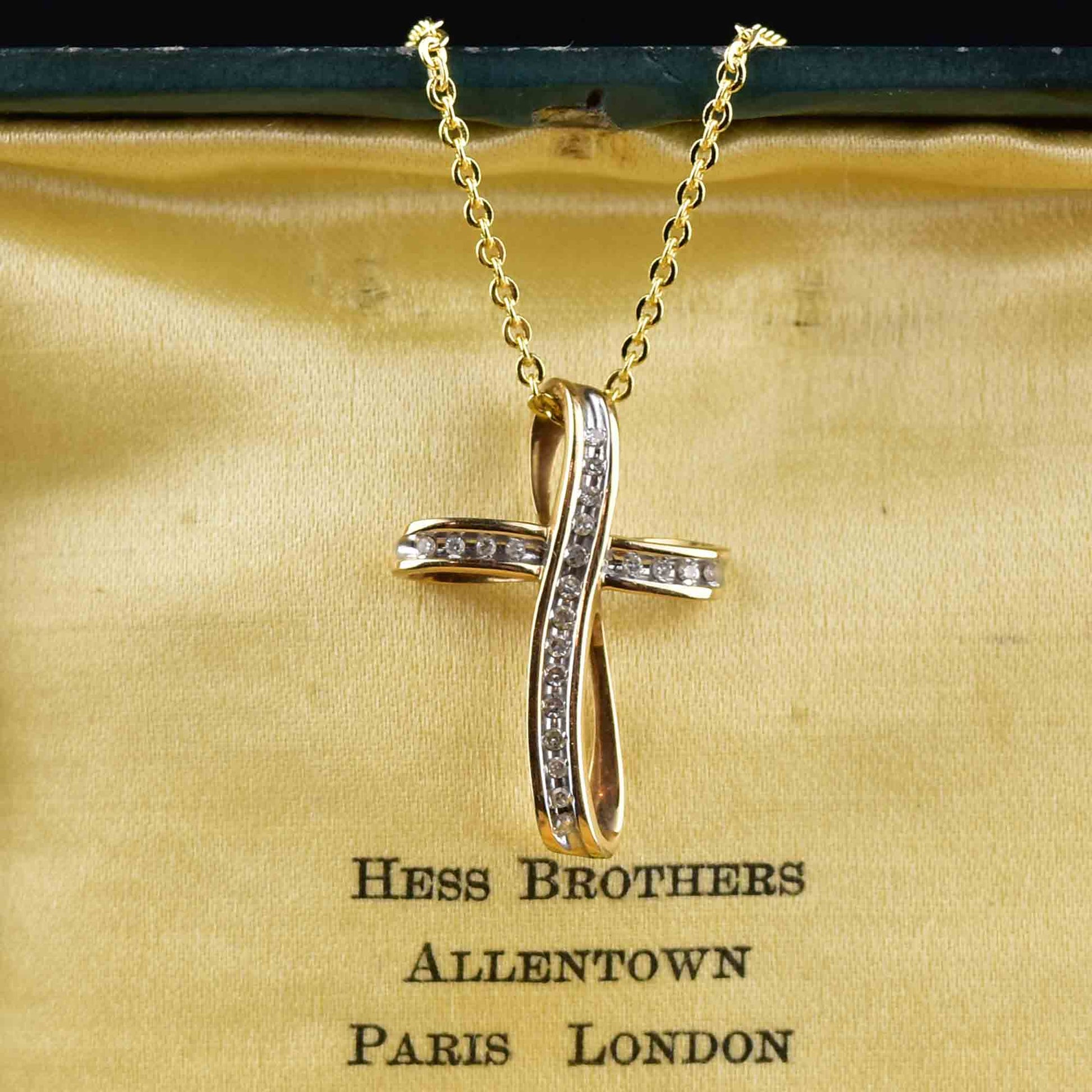 A beguiling antique 10K yellow gold cross necklace bedecked with rows of scintillating diamonds. The cross showcases the diamonds set in gold with open-backed craftsmanship, accentuating them to maximum effect. An impeccable piece of religious jewelry, it makes for an elegance-laden gift! The necklace is in fine condition, its diamonds twinkling delightfully.