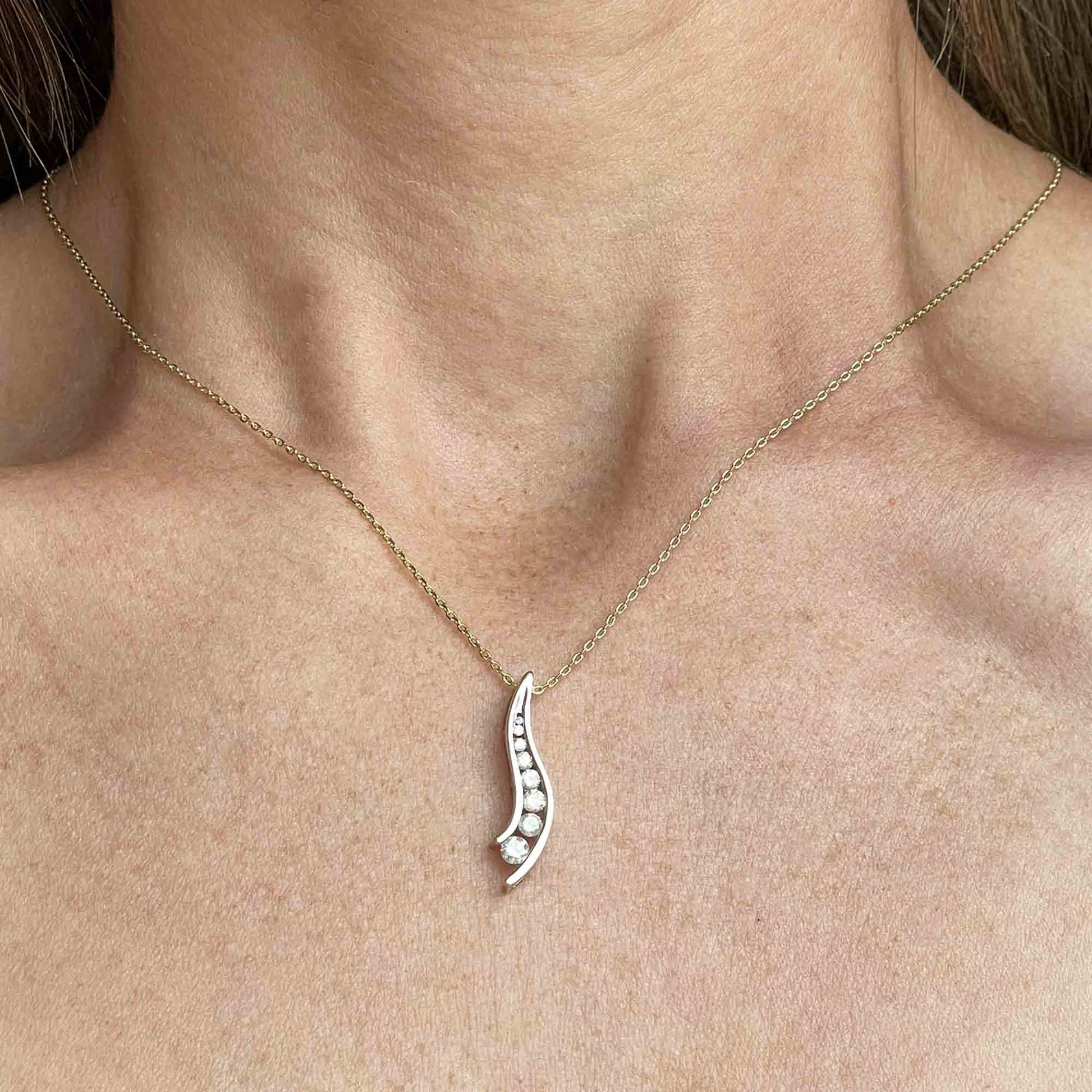 This 10K yellow gold journey style pendant necklace is adorned with .50 carats of diamonds, arranged in a graceful twist pattern. To your girlfriend or fianc¨¦, the journey necklace symbolizes a life adventure with them; to your wife, it conveys the message that your love for her has blossomed over time, and that you wish to travel the rest of the journey by her side. A charmingly sentimental piece of jewelry!