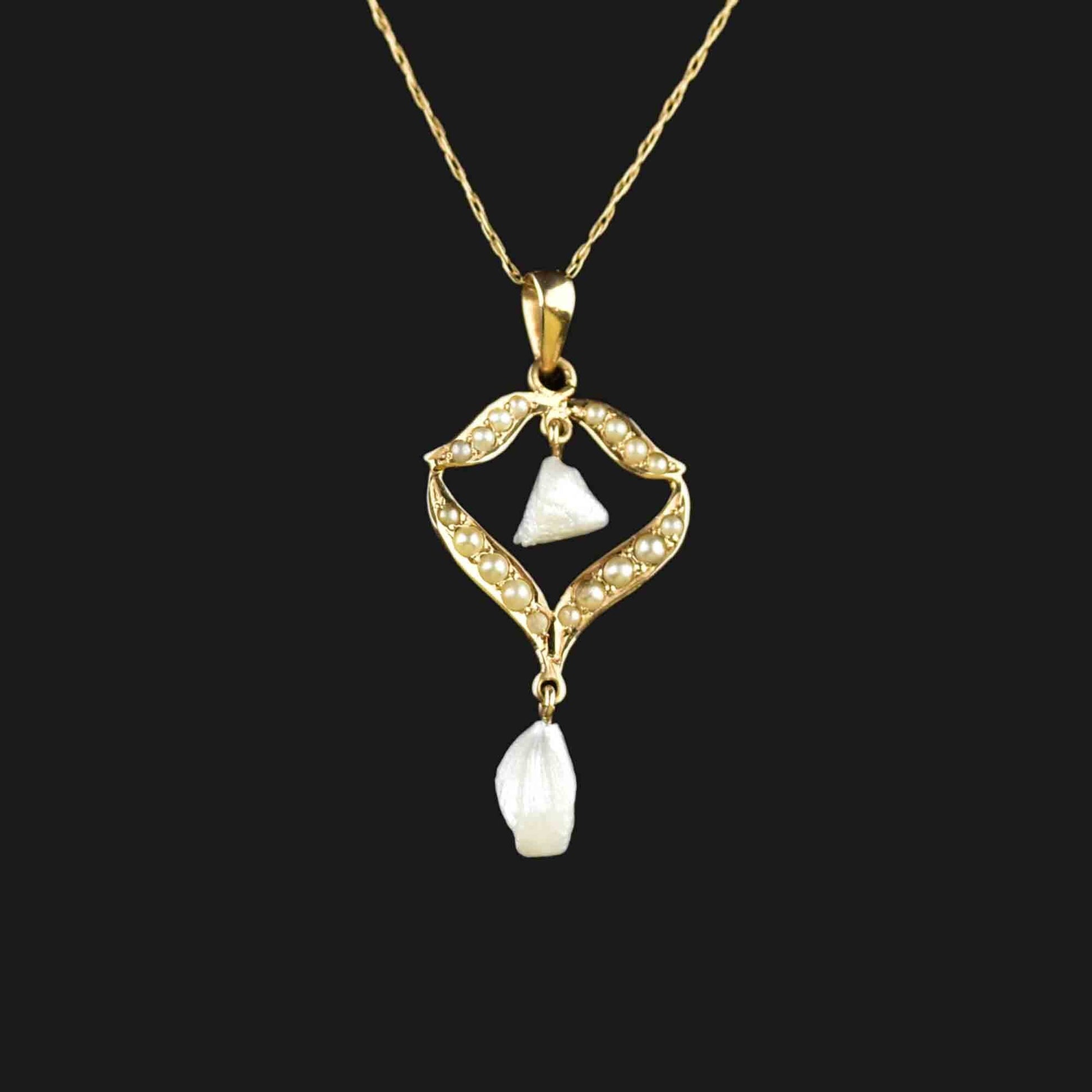 This marvelous Edwardian-era 10K-gold lavaliere necklace is a real treasure! Showcasing multiple delicate freshwater seed pearls in a dogtooth pattern with a shimmering center pearl and a large natural pearl beneath--it's a sight to behold! Crafted with incredible precision and finesse!