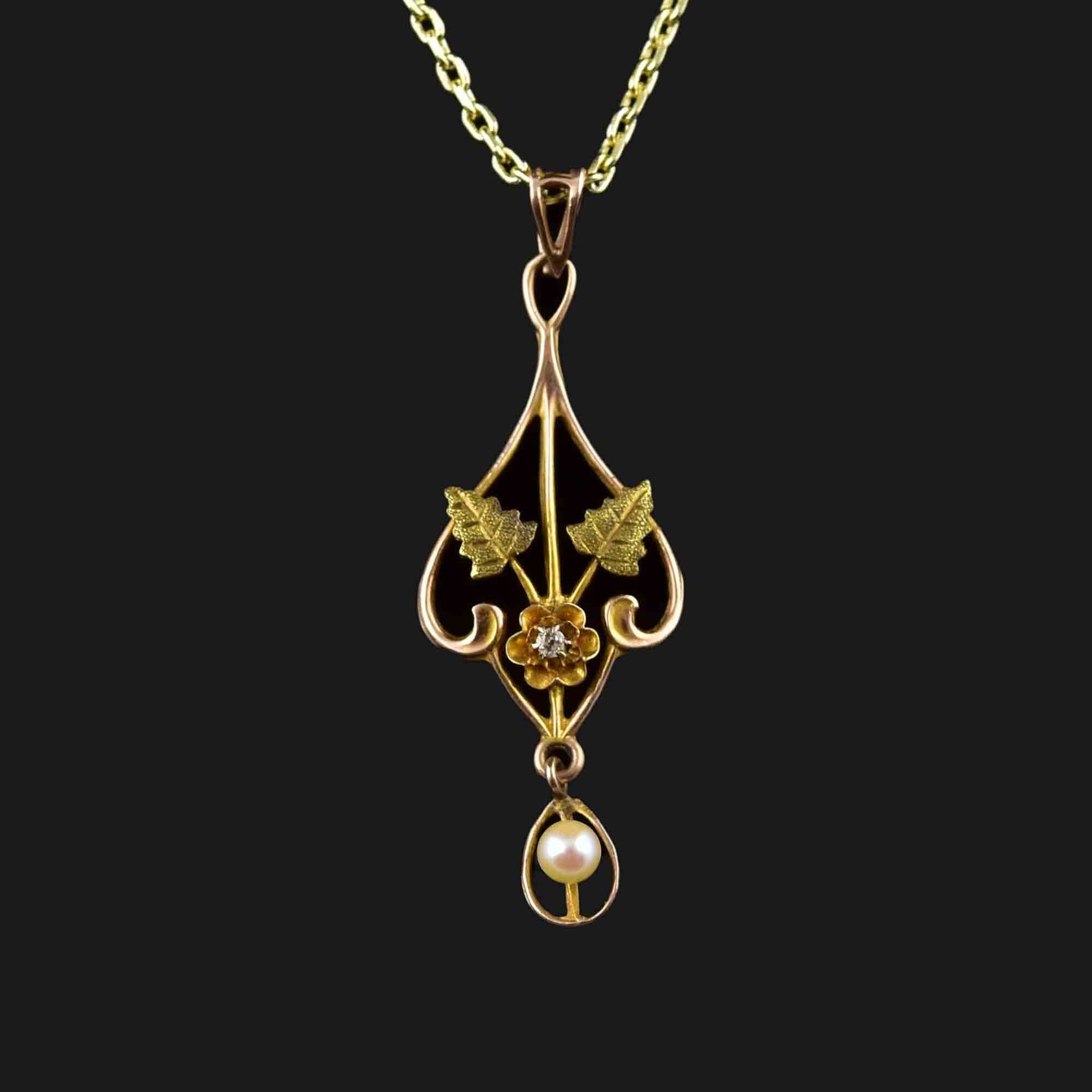 10K Gold Leaf Diamond Pearl Lavalier Pendant Necklace