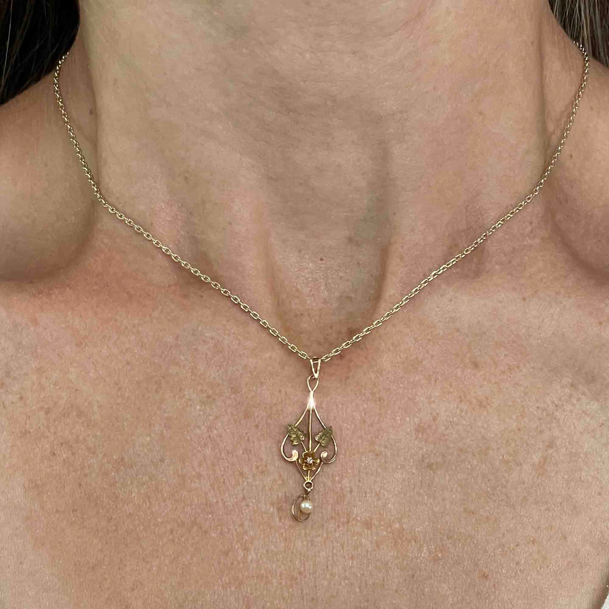 This gorgeous lavaliere necklace is crafted with 10K gold and adorned with delicate freshwater pearls and a sparkling diamond. The centerpiece is a buttercup set diamond, accented by two dancing leaves at the top and a dangling pearl below. The intricate craftsmanship and attention to detail make this piece truly precious.