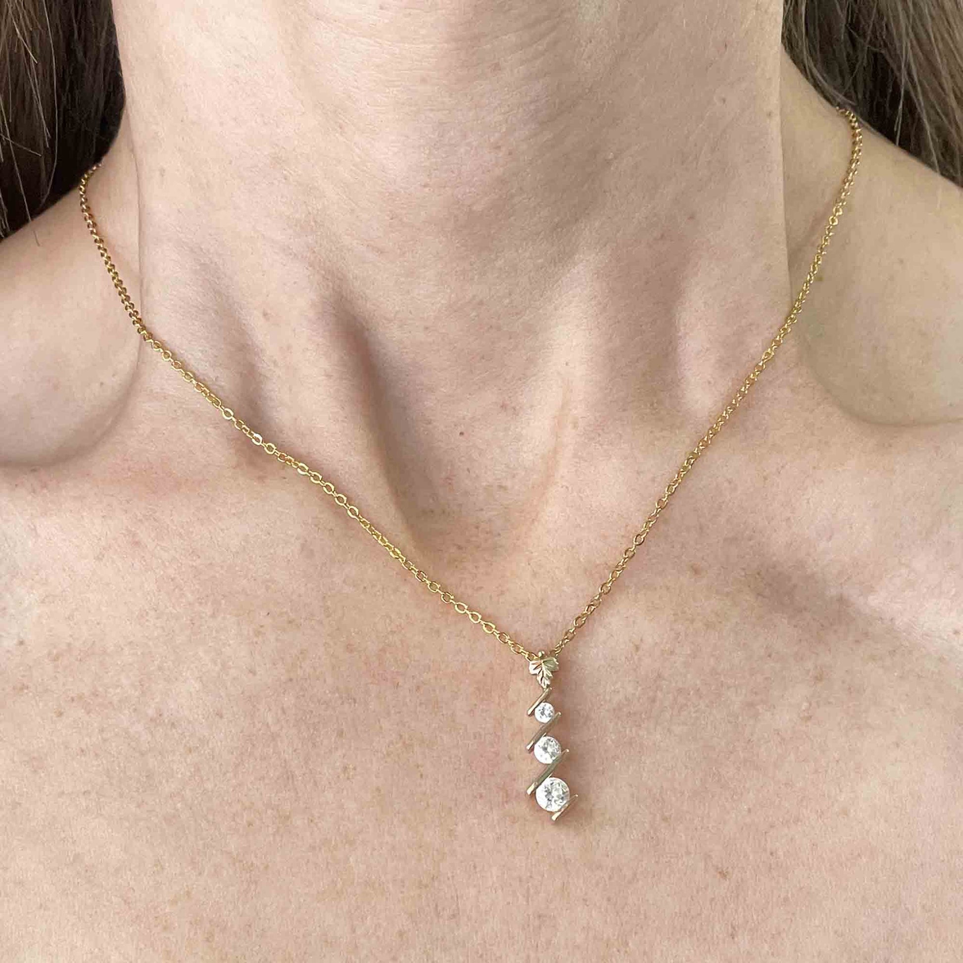 This exquisite pendant necklace features three stunning quartz stones, skillfully arranged between 10k gold bars and a delicate gold leaf. Its sentimental design makes it a treasured piece of jewelry, perfect for any journey.