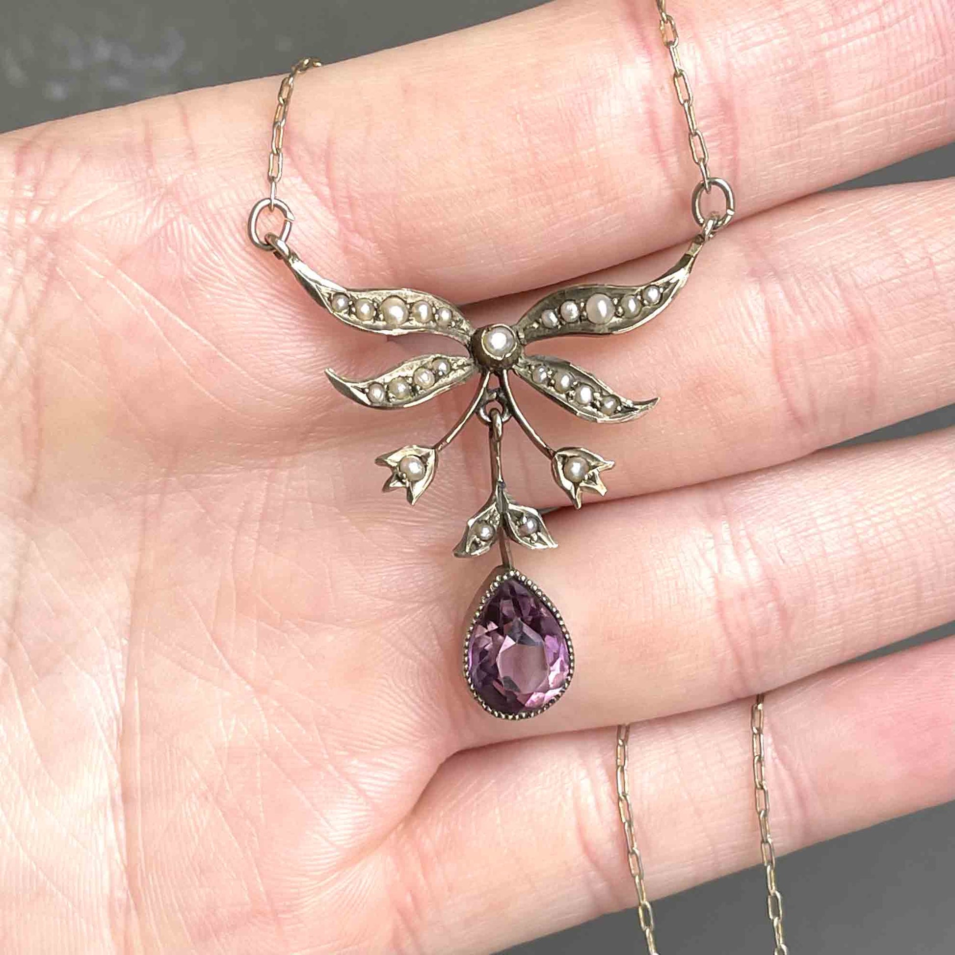 Darling 10K gold lavaliere pendant necklace with a natural amethyst and natural pearl accents. The antique pendant has a darling pale pear cut amethyst stone swaying below a leaf style 10k gold mounting studded with dainty seed pearls. Elegant and refined making this the perfect gift for the February birthday or for those loving purple! The pendant is in good condition with no noted nicks or chips to the stone or pearls.
