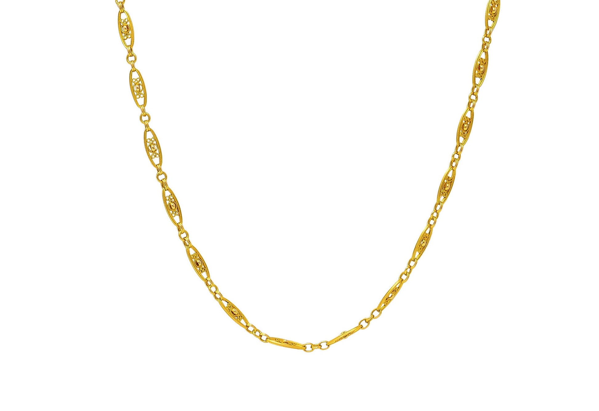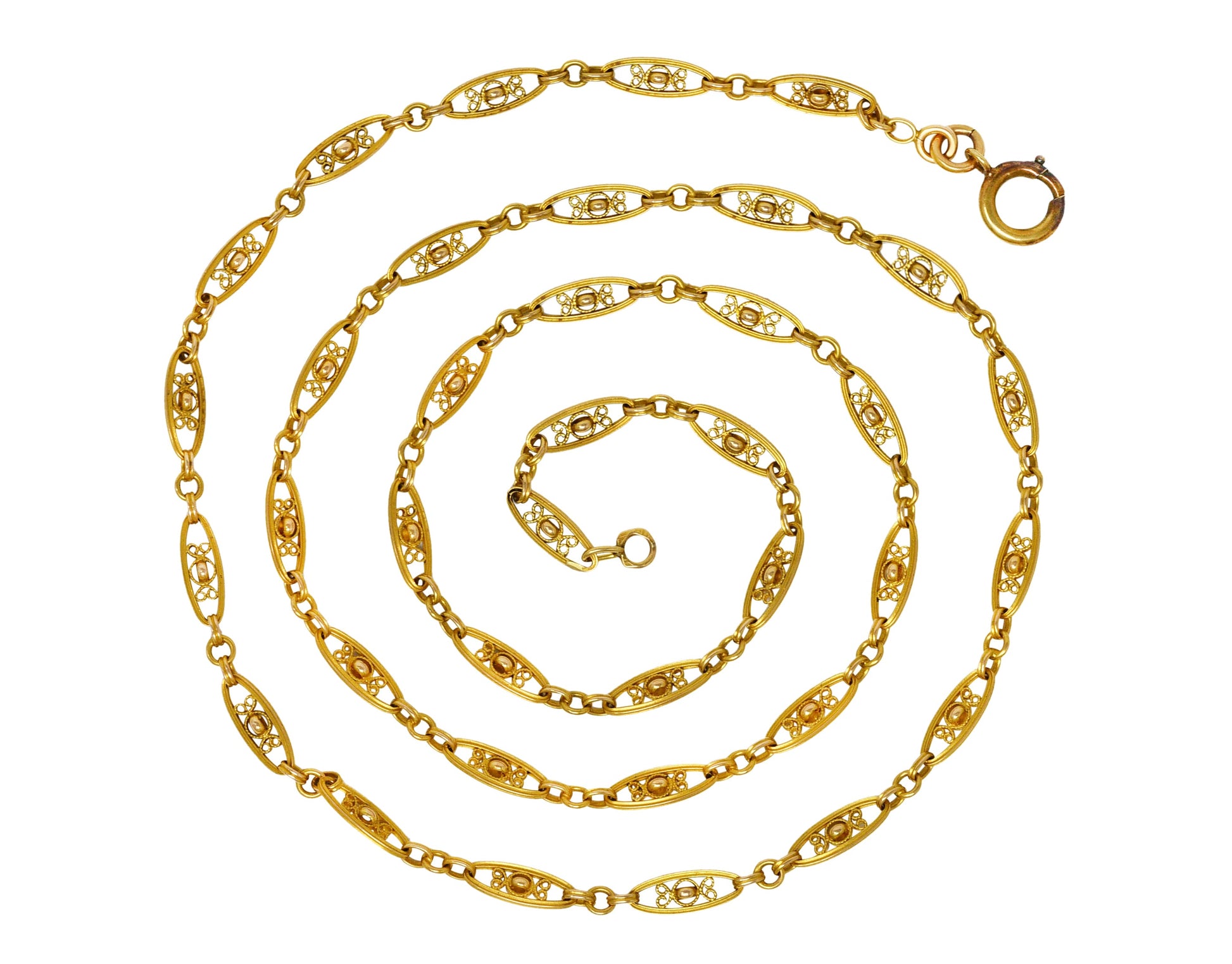 - Chain is comprised of navette shaped links centering gold rings with curling filigree surround
