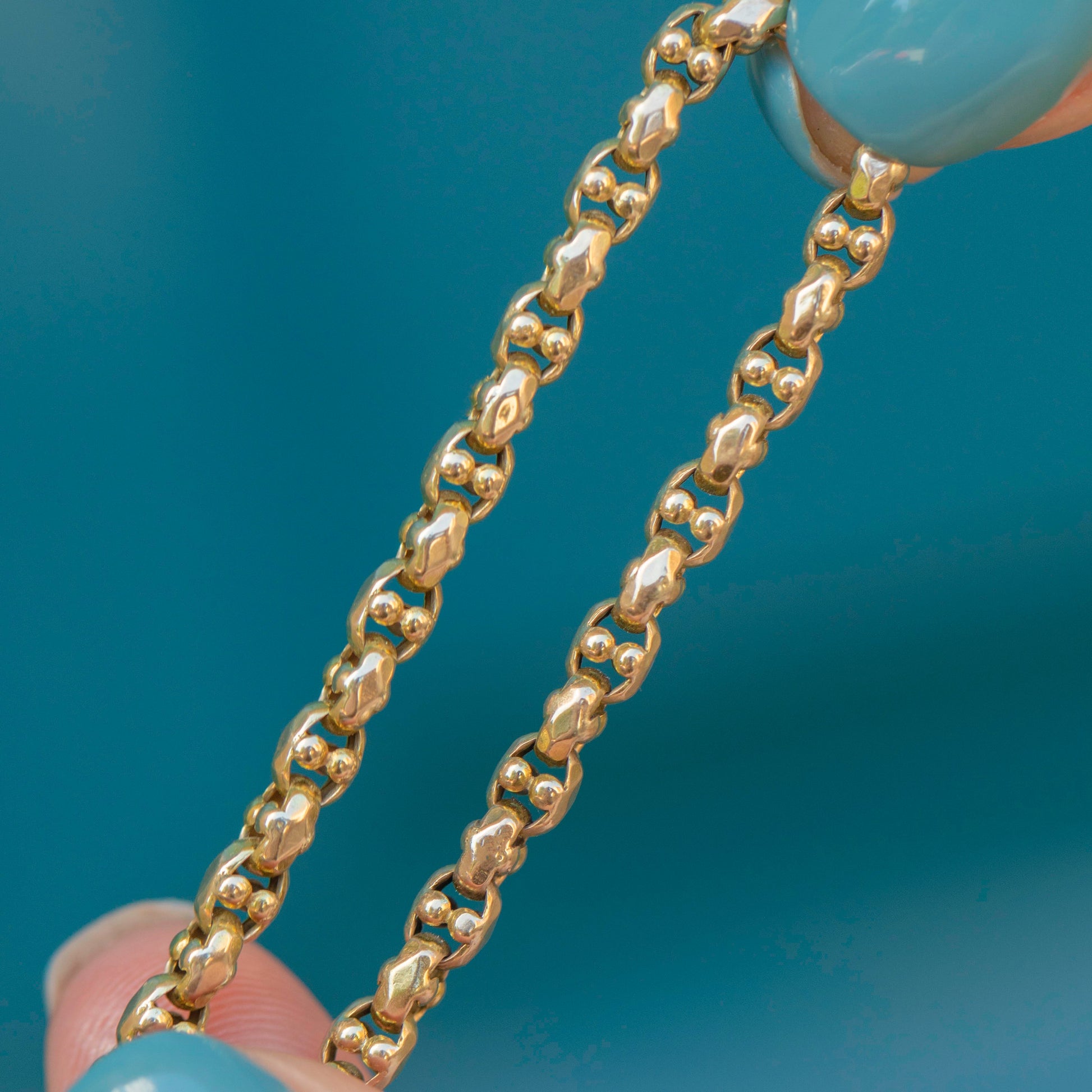 At 16 long and fastened with a bolt-ring, this antique belcher chain is a versatile piece and will sit comfortably and securely across your collarbones. Everyone needs a classic Victorian Gold chain in their antique jewellery collection, and this unique and chunky delight would make a fantastic choice!?Item Details: