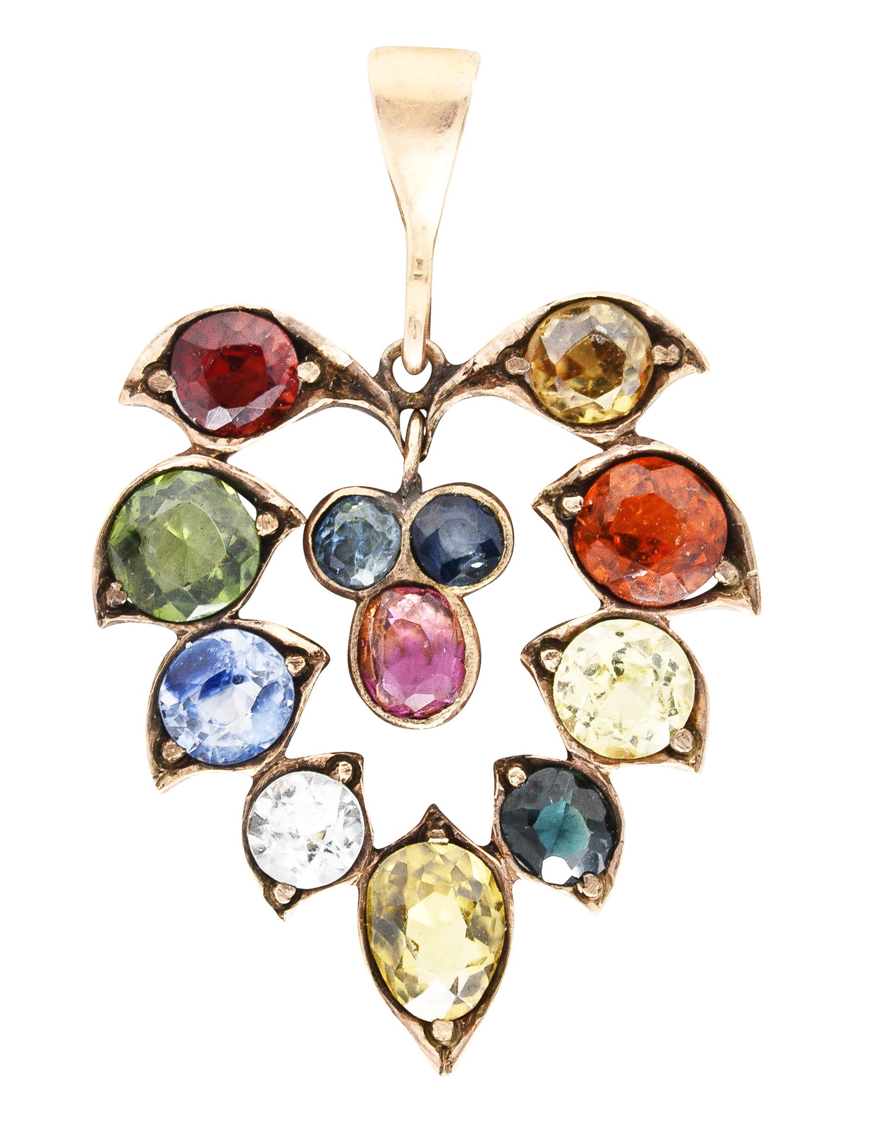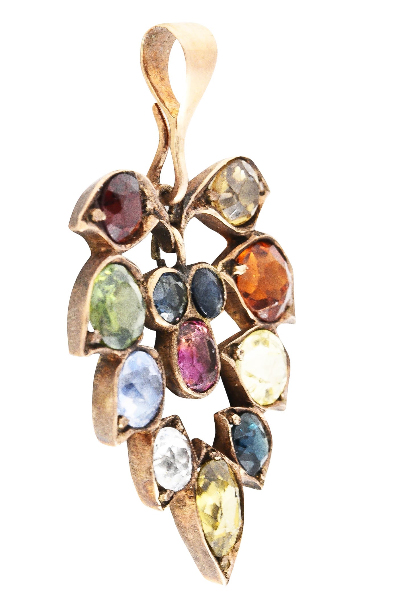 1860's Victorian Fancy Sapphire Zircon Garnet 14 Karat Yellow Gold Antique Floral Leaf Pendant