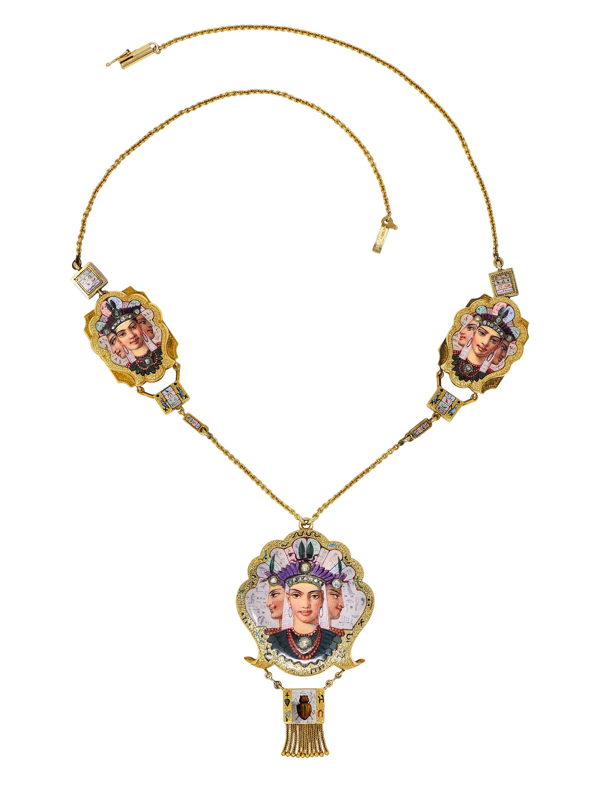 1870's Egyptian Revival Enamel Rose Cut Diamond 18 Karat Gold Goddess Victorian Swag Necklace