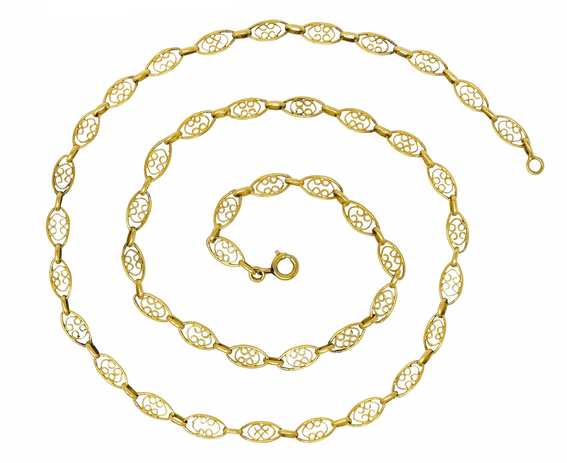 1900 Victorian 18 Karat Gold 24 Inch Scrolled Navette Chain Link Necklace