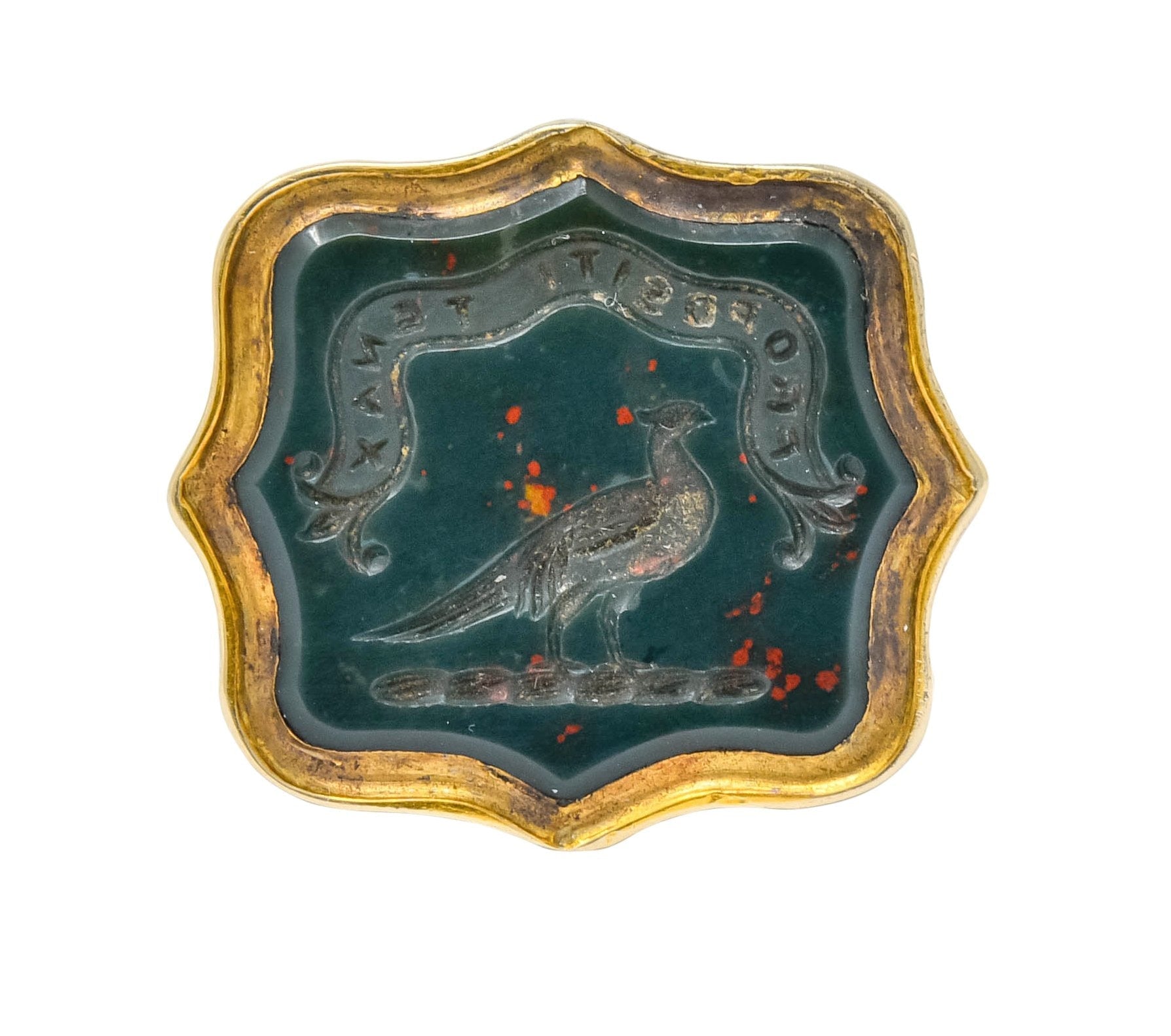 - Embedded with an intaglio bloodstone deeply engraved to depict a poised pheasant with scrolled ribbon in verso 'propositi tenax' Latin for firm in purpose