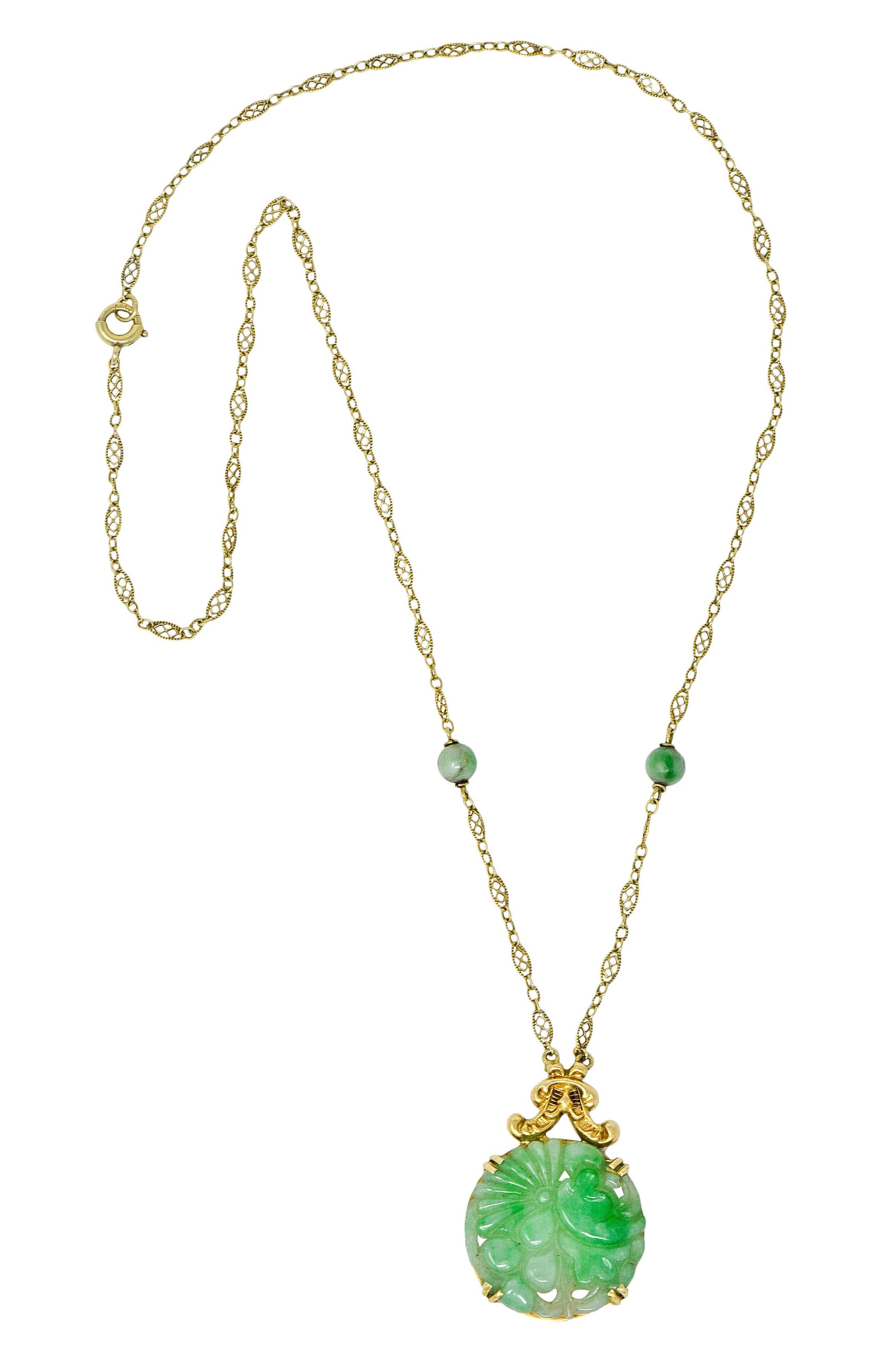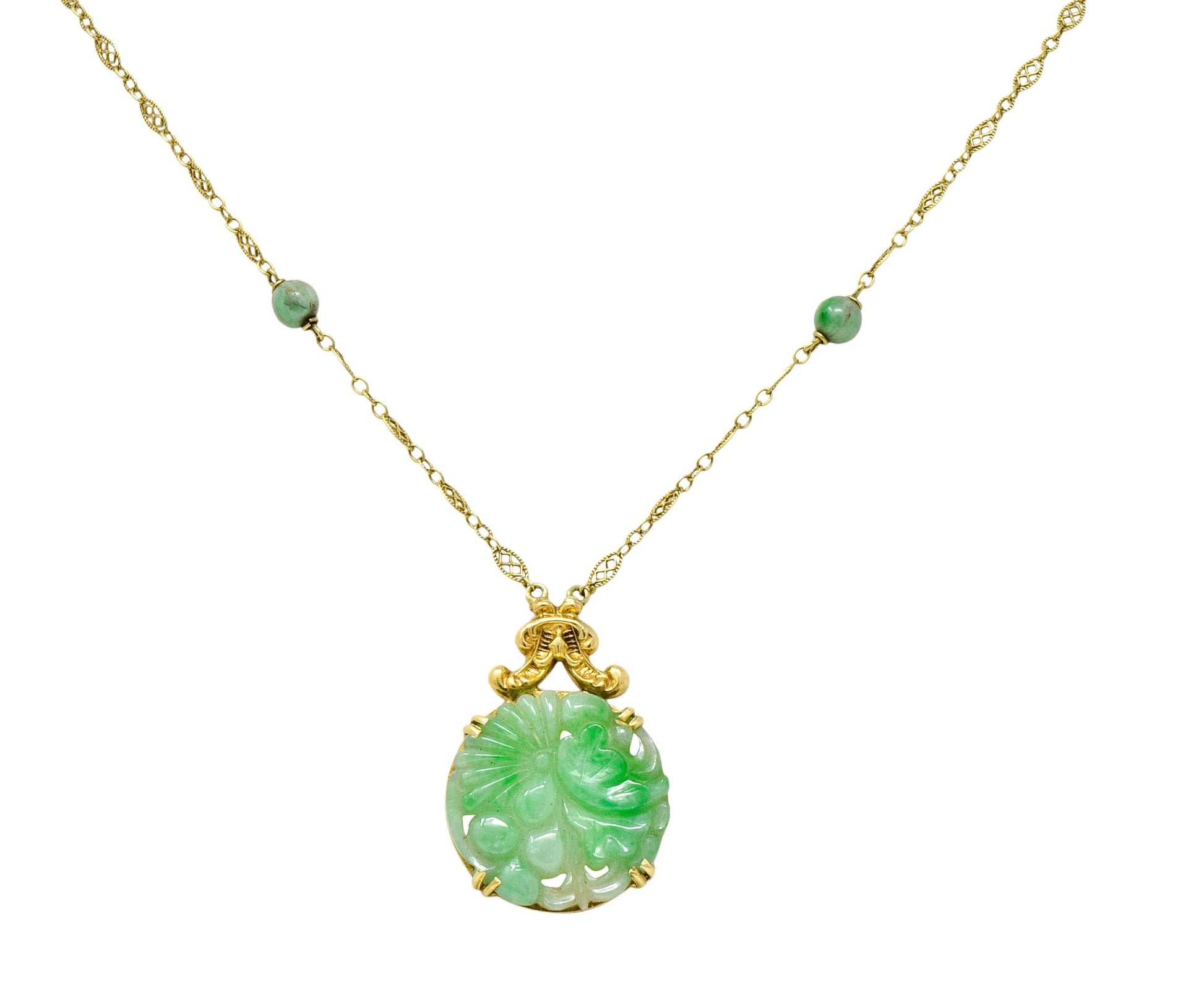 1940's Retro Carved Jade 14 Karat Gold Floral Pendant Necklace