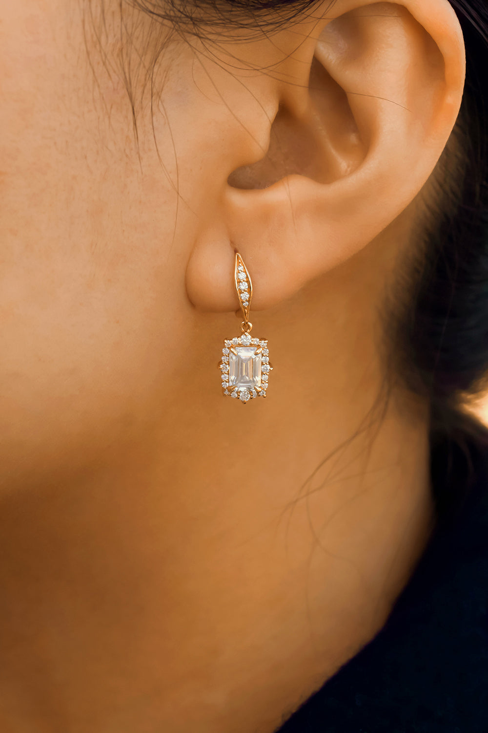 Our pair of Elizabeth Earrings comes affixed to hook clasp backings with bright dangling pendants. A graduating halo comprised of genuine lab-grown white diamonds frames each of the beautiful 7x5 mm emerald-cut moissanite center stones. The stones are set in 14-karat gold metal and are finished with a high polish. Diamond-lined spades decorate the clasps for a regal continuity leading directly to the hanging adornments. Caging arches of solid gold streamers bind the backside of the pendants in a simple yet antique fashion flare.