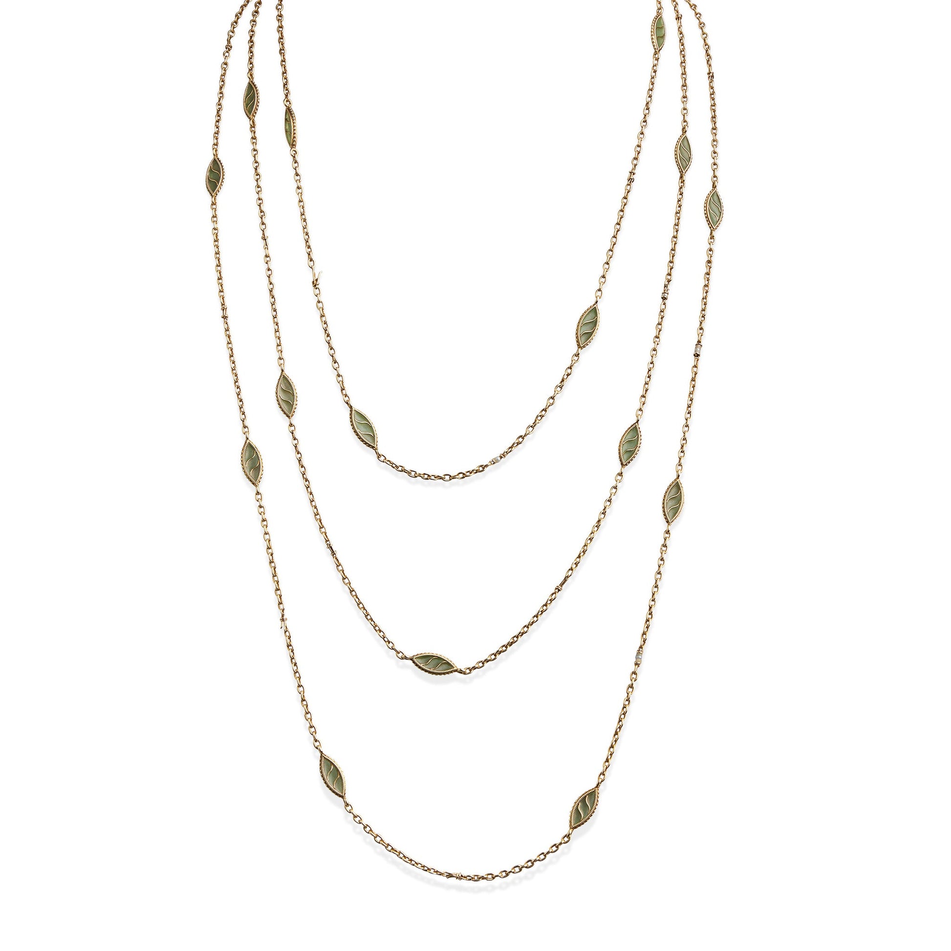Created around the turn of the 19th century, this longchain necklace is composed of 18K gold and plique-¨¤-jour enamel. It is composed of tracelink chain highlighted by navette form green plique-¨¤-jour enamel links accented by double curved lines and edged with spherules. This opulently long and unusual chain extends over five feet, making for a versatile and unique jewel.