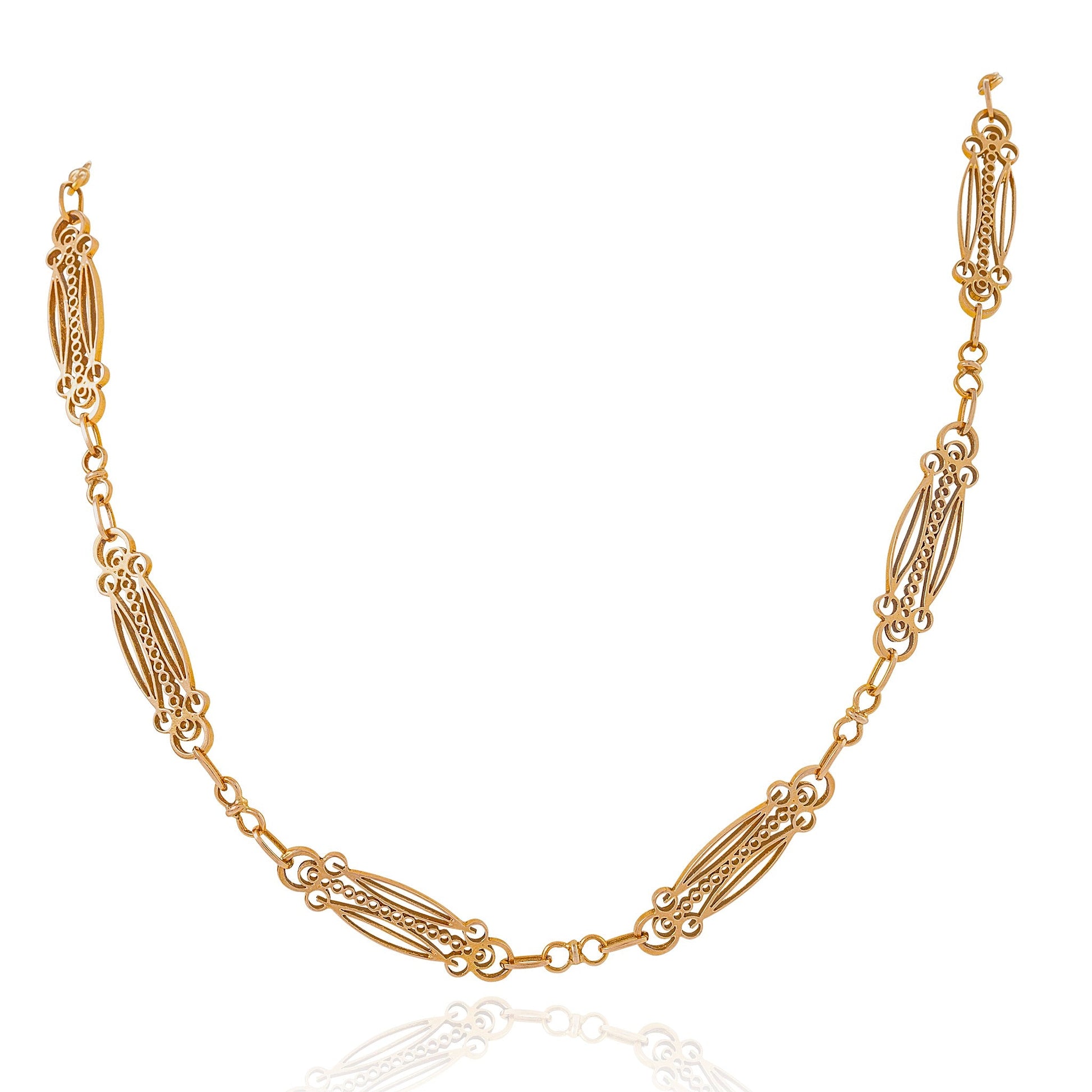 Composed of gold, this French Art Nouveau long chain necklace was created around 1900. The fancy elongated links each contain an interlocking series of circular, elliptical and trefoil motifs, and are joined by twinned circular trace links for flexibility. Combining a pleasing heft with a graceful, airy design, this versatile necklace easily doubles to stand on its own, or nests among complementary period chains.