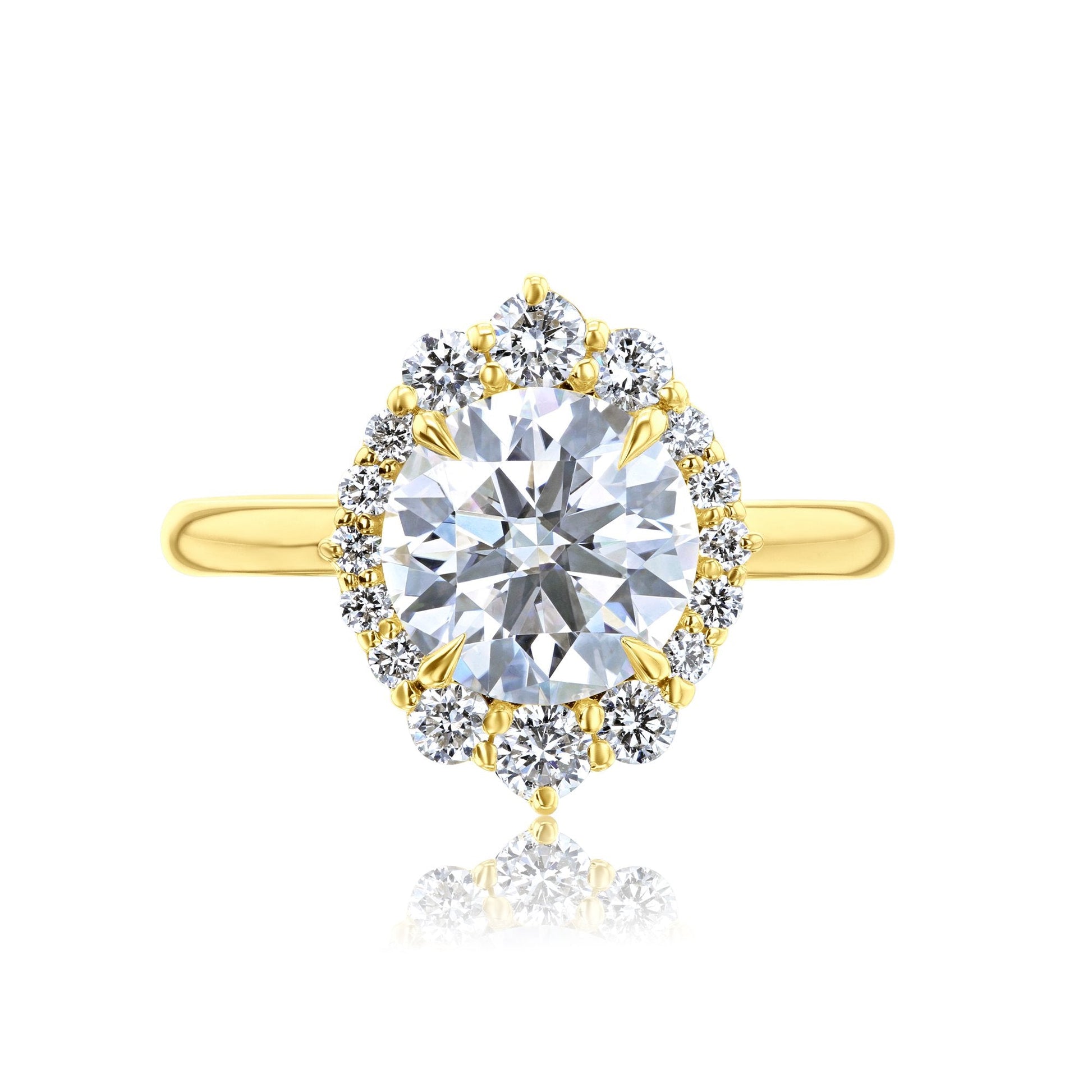 Raphaela is one of the six engagement rings from our vintage styled collection, The August. It features a 9x7 mm round moissanite gemstone illuminated with a halo of 20 round lab-grown diamonds prong-set in a stunning 14-karat solid gold metal with a high polish finish.