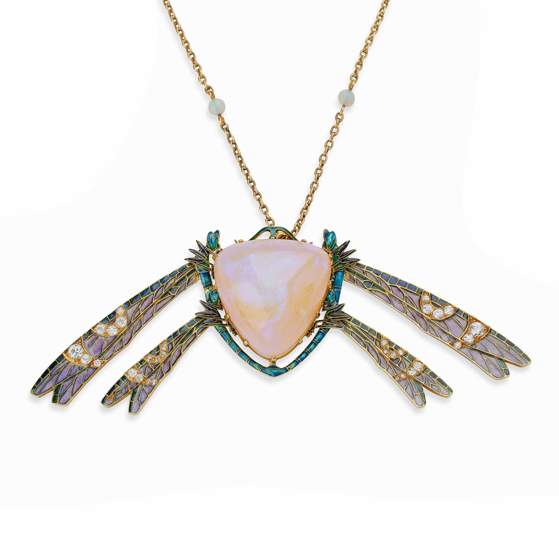 Created circa 1900-1902, this damselfly pendant necklace by Ren¨¦ Lalique is composed of plique-¨¤-jour, pailonn¨¦, and champlev¨¦ enamel, fire opal, diamonds and 18K gold. It is designed as four damselflies with champlev¨¦ and plique-¨¤-jour enamel wings, in shades of lavender and indigo, with touches of green, highlighted by old European and old mine-cut diamonds,joining slender opalescent blue paillon¨¦ (foiled) enamel bodies, the reverse with elaborate chased designs, roosting on a fire opal cabochon, suspended from a later trace link chain punctuated by opal beads. A masterful study in challenging enamel techniques, this rare jewel summons a mood of beauty, peace and evanescence in nature.